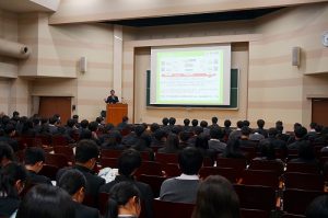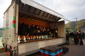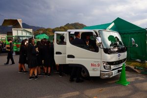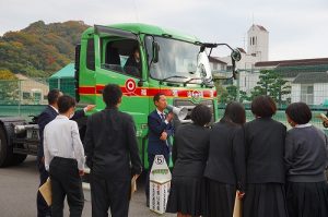 11月27日、2年生を対象に広島県トラック協会よりイメージアップ体験スクールを開催し、福山通運株式会社常務執行役員 八木野様に「トラック運送と物流の役割について」を講演していただいて、実際にトラックの見学・乗車体験を行いました。講演では、運送=ドライバーというイメージですが、事務、トラック整備など様々な職種が関わり成り立っていることを知ることができ、乗車体験では、大型車の運転席に座り運転席から死角になる部分を確認できるなど、たいへん充実した時間となりました。