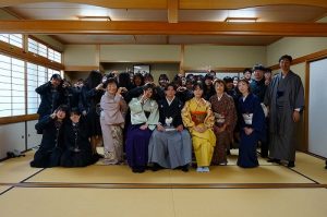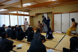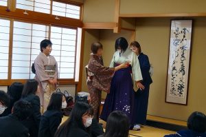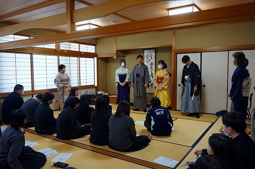 京都きもの学院広島校から3名の先生をお招きし、3年ビジネス科課題研究の授業で着物の着付け教室を行いました。 振袖と羽織袴の正装と女性の袴と男性の着物も着付けをしていただきながら、和装の種類や男女の違いなどを学びました。また、お辞儀や座る時などの立ち居振る舞いも教えていただきました。