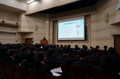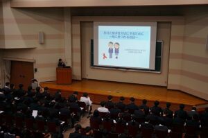 1月15日、広島県西部保健所広島支所より保健師の岡田先生と勝部先生にお越しいただいて、1年生を対象に「自分と相手を大切にするために ~性にまつわるお話~」と題した講演を実施しました。性感染症に関する疾病や予防法、性の多様性などについて学びました。