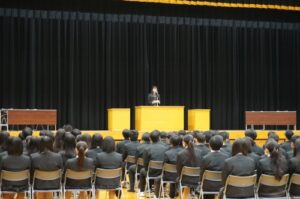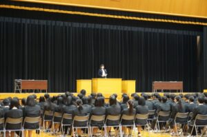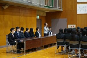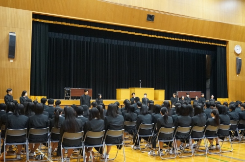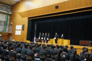 28日、白鳩同窓会より会長 石岡様と理事3名にお越しいただき、同窓会入会式を行いました。 会長の石岡様より「これから進む道はそれぞれ違いますが、先生・友達との繋がりを大切にしてください。 それは自分の一生の宝物になると思います。」とお言葉を頂きました。3年生を代表して狩山さんが同窓会入会の言葉を述べ、最後に各クラスより選出した新実行委員の紹介がありました。 続いて、漢字トレーニング年間の表彰がありました。