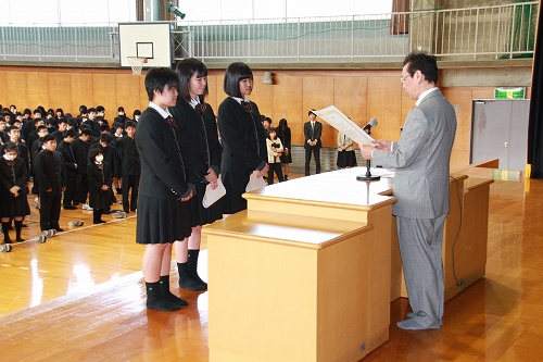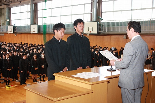 生徒朝礼で、クラブ活動の表彰伝達を行いました。