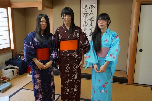 京都きもの学院広島校から3名の先生をお招きし、3年生の課題研究で秘書実務を選択している生徒がゆかたの着付け講座を受講しました。 今回は、先生方のご指導のもと、実際に一人でゆかたを着ました。隣同士補正したり助け合いながら、なんとか全員きれいに帯結びもできました。 とうかさんが楽しみですね。