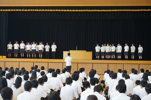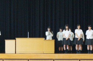 続いて、壮行式では、全国大会に出場する5クラブの紹介後、校長先生と、生徒会長から激励の言葉を頂き、各クラブより「感謝の気持ちを忘れず、悔いの無いよう、しっかり頑張ります。」と決意表明がありました。