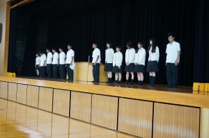 7月18日に1学期の終業式が行われました。 終業式に先立って生徒会交代式も行われ、平成25年度生徒会長福岡君の挨拶の後、新生徒会長の久保さんより生徒会役員14名の紹介がありました。