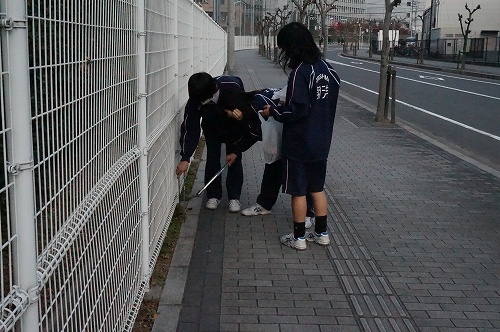 落ち葉が舞う中、3年生が学校周辺をクラス毎に分かれて清掃活動をしました。