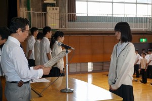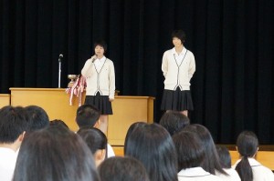 16日の生徒朝礼で、和歌山県で開催される「第70回国民体育大会」に、広島県の代表として出場する女子剣道部の小山さんと女子バレーボール部の蠣崎さんの壮行式を行いました。