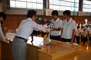 生徒朝礼で国体の壮行式と表彰伝達を行いました。