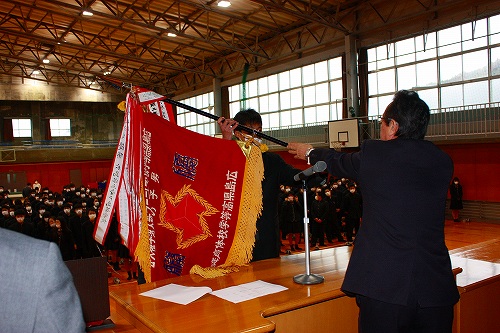14日 生徒朝礼で、男子ソフトテニス部、剣道部、空手道部、珠算部、ワープロ部、吹奏楽部の表彰報告を行いました。