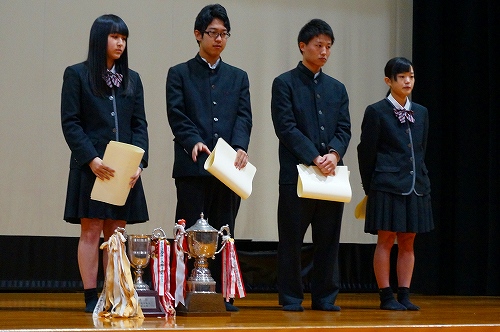 15日 生徒朝礼で、剣道部、ソフトテニス部、珠算部、吹奏楽部の表彰報告を行いました。