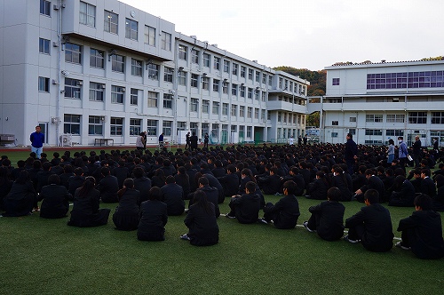 13日、火災を想定した避難訓練を実施しました。 非常放送の指示に従って、速やかにグラウンドに避難しました。 生徒全員の点呼完了後、避難するときの注意点「お・は・し・も」(おさず・はしらず・しゃべらず・もどらず)の再確認と、校長からは命を守る行動について話がありました。