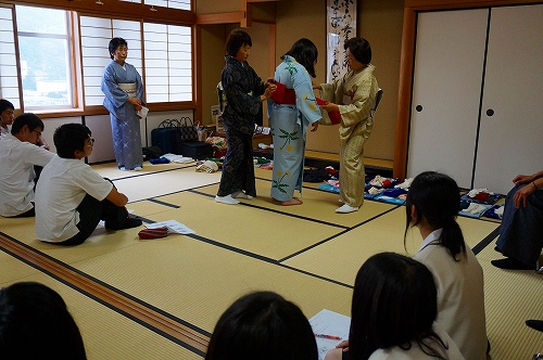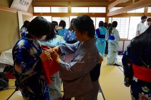 京都きもの学院広島校から3名の先生をお招きし、ビジネスマナーとオフィススキルの授業を選択している3年生が、ゆかたの着付け講座を受講しました。 先生方にひとつひとつ指導していただいて、女子は全員ゆかたを自分で着ることが出来ました。男子も帯の結び方を習い練習しました。とうかさんが楽しみですね。