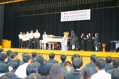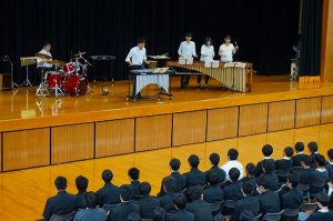 11月8日、高大連携の一環として毎年開催しているイベント、広島文化学園大学 学芸学部音楽学科によるコンサートが行われました。 今年で16回目となるコンサートでは、フルートの音色で始まり、マリンバを中心とした打楽器アンサンブルや山下先生によるソプラノ独唱を聴き、最後に生徒たちと一緒にジブリの歌を歌う企画もあり、あっという間で楽しい1時間でした。