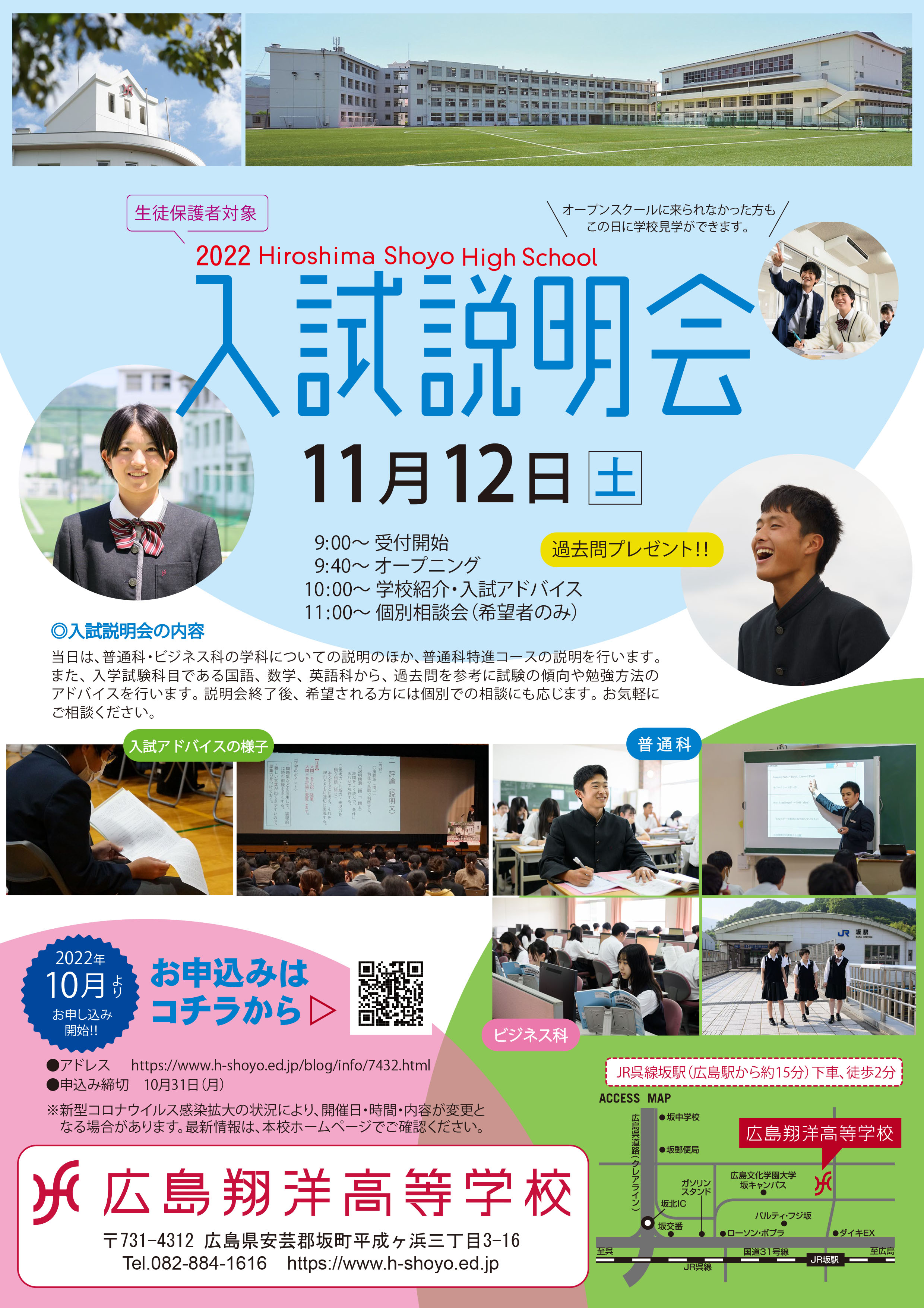 ※ 新型コロナウイルス感染拡大の状況により、開催日・時間・内容が変更となる場合があります。最新情報は、本校ホームページに掲載いたしますので、必ずご確認ください。
