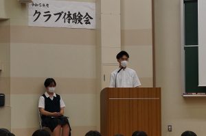 オープニングは大講義室で行い、吹奏楽部のファンファーレで開会し、司会はバレーボール部2年生の小出さんが務め、生徒を代表し空手道部主将2年生の山﨑くんが挨拶しました。そして、クラブ紹介動画を見ていただいたのち、各クラブの活動場所で、監督・コーチや先輩と練習し一緒に汗を流して、翔洋のクラブ活動を体験していただきました。練習後は、希望者に食堂の見学と個別相談会も実施しました。