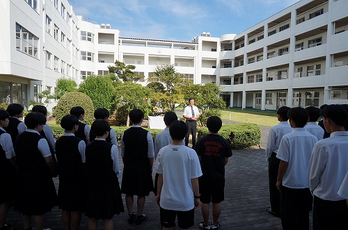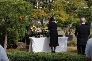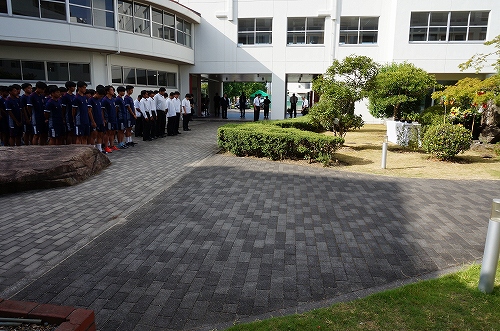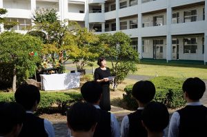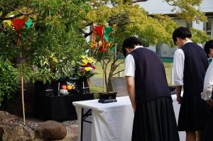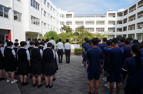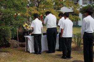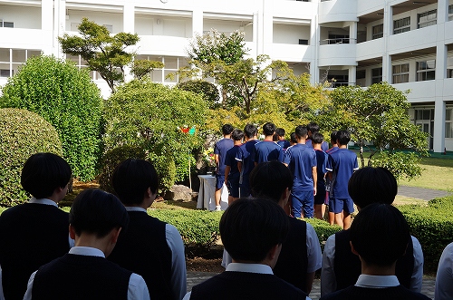 校内の慰霊碑前にて追悼式を行いました。同窓会会長石岡様、教職員と生徒会・クラブ活動で登校していた生徒約100名が参列し、午前8時15分の鐘とともに黙祷し、静かに祈りをささげました。